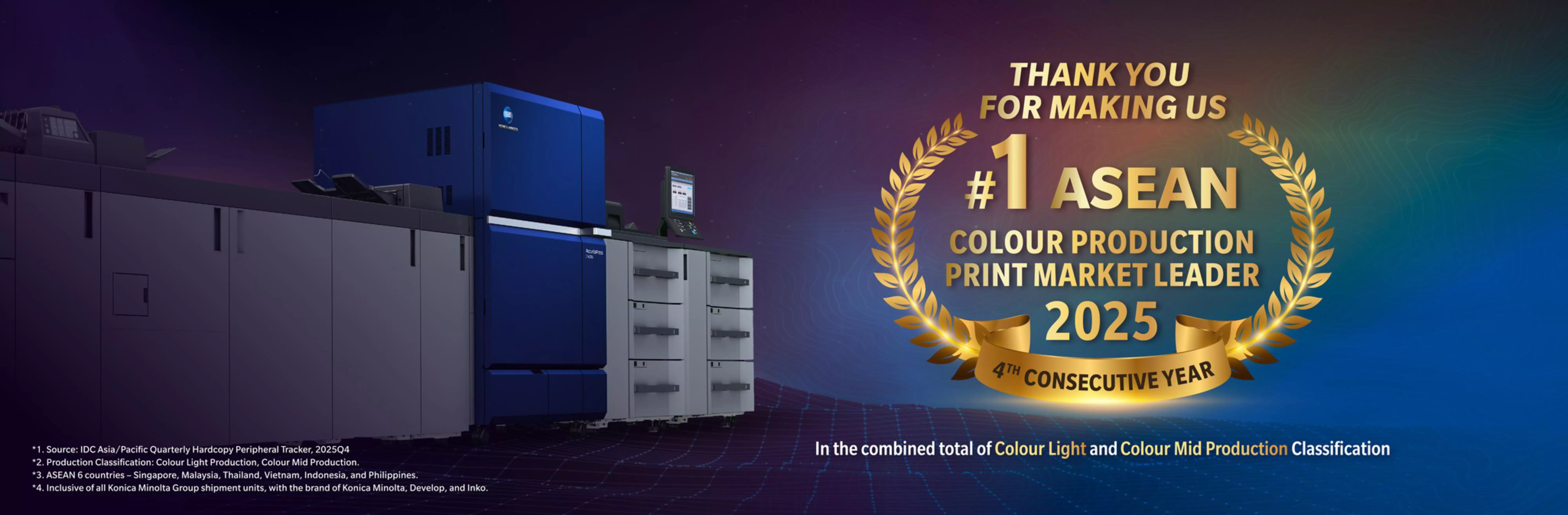 Konica Minolta Business Solutions Asia has once again secured the No. 1 market share position in the combined total of Colour Light and Colour Mid Production Classifications across ASEAN for 2025, marking the fourth consecutive year of leadership in the region.